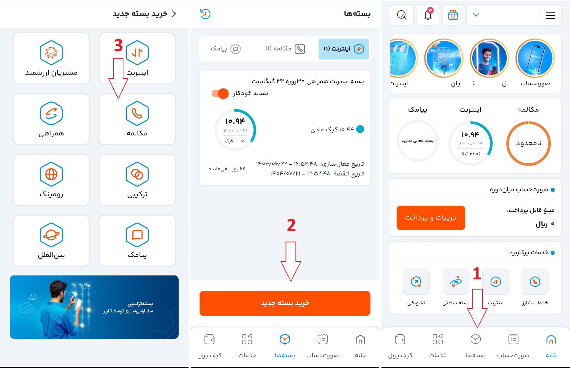 | تخفیفی (30% یا 50%) | به همراه اولیها یا تلفن ثابت زنگ میزنید بسته ماهیانه میخواهید مصرف ماهیانهتان متغیر است تمدید خودکار میخواهید |
