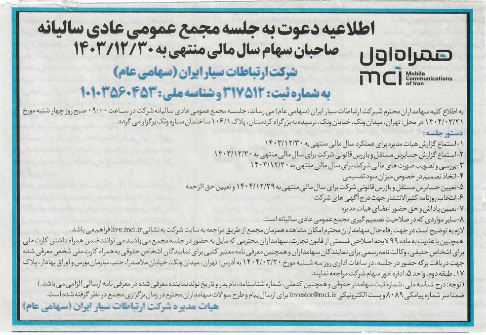 آگهی دعوت به مجمع عمومی عادی سالیانه منتهی به 30 اسفند 1403 حجم : 188 کیلوبایت